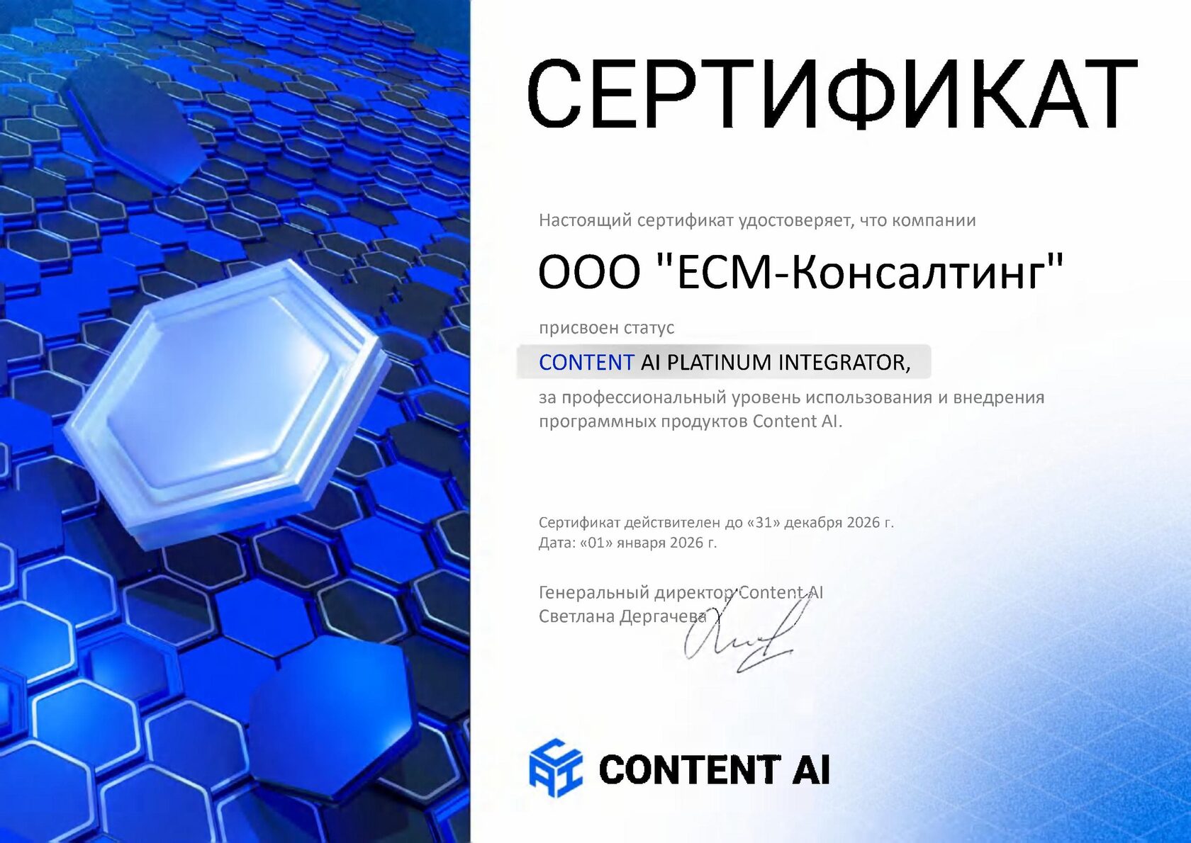 Компании «ЕСМ-Консалтинг» по результатам 2025 года присвоен высший партнерский статус Content AI, разработчика ИИ-решений для автоматизации процессов обработки документов, —Content AI Platinum Integrator.
